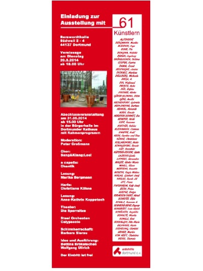 Die Vernissage ist am 20.05.2014 ab 18 Uhr in der Berswordthalle, Dortmund 31.5.2014 Abschlussveranstaltung im Rathaus, Dortmund